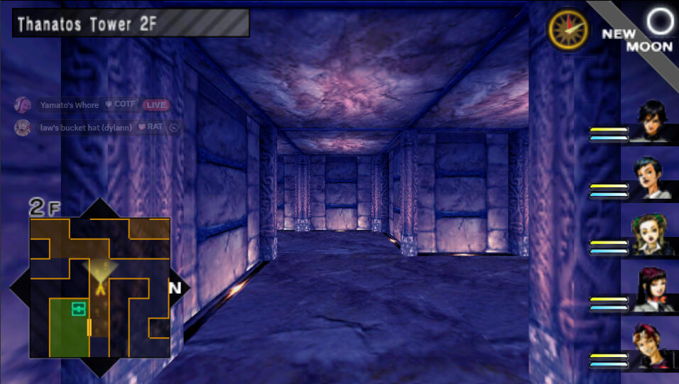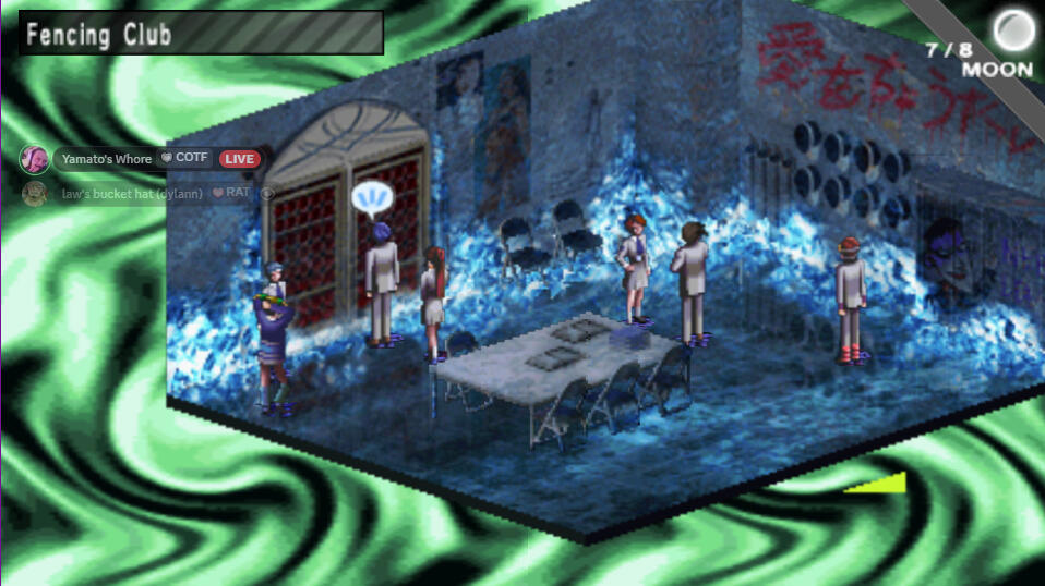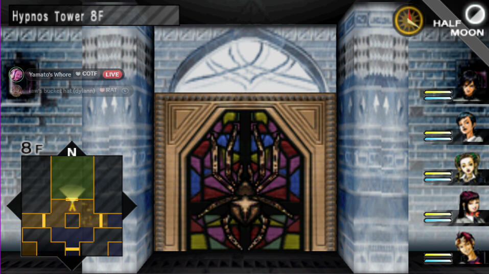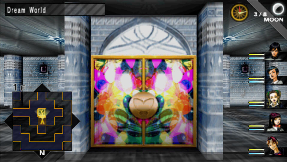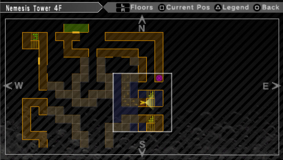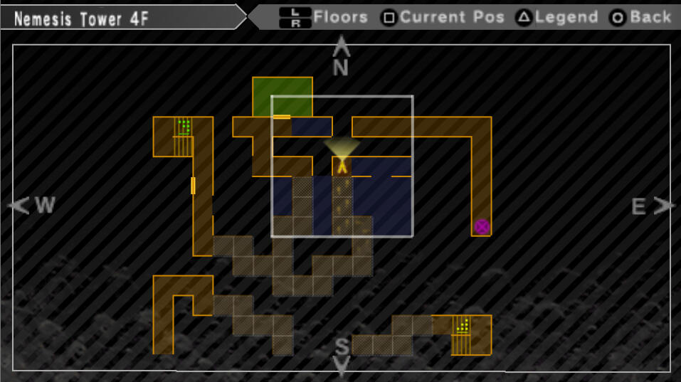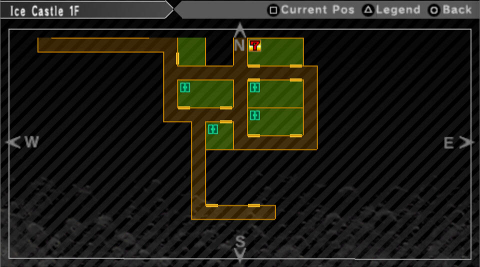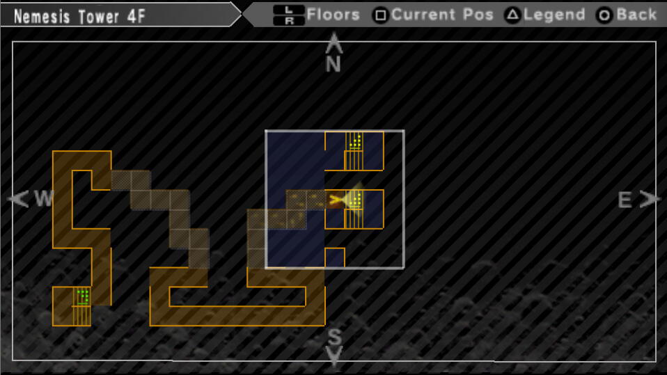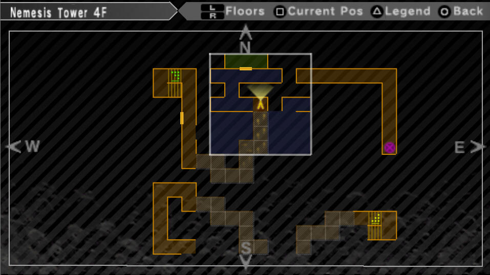 Then just take that first hall that leads south and follow it all the way to a classroom. Enter. Before you speak to the Jack Frosts, open the closet door to the left of the blackboard to find Kouma Staff. Go ahead and speak to the Jack Frosts now and agree to be their friends. He will offer you to be teleported upstairs, say yes.5F: Before you leave this room, open the cabinet in the top corner to find Soma x2. Leave the room and climb the stairs just to the east.6F: Follow this path just to the north to find yourself in an intersection between two sets of stairs. Go down the stairs to the east.5F: Follow this path and you'll see a classroom. Enter, and speak to the girl painting for a cutscene. After the cutscene, backtrack back up the stairs you came down from.6F: There is another set of stairs to the north of these ones, take these up 2 floors.8F: Just around the corner, there is a classroom. Enter it and open the cabinet in the top corner to find Numerous Bell. You can backtrack down those stairs two floors again now.6F: From these stairs, head to the northwest stairs this time, and take them down.5F: Take this path to the north, passing the first flight of stairs you see. Follow it to the east to find a second staircase and take those up.6F: Head just to the east of where you came up to find another set if stairs and take them up.7F: Head north up the hallway and take the stairs to the east up.8F: You should see a classroom right away, enter it and open the cabinet in the top corner to find Lone Sword. Exit the classroom and follow the hallway west until you see a set of staircases. Take the northern set down.7F: Follow the path to find a classroom, and enter. Mood change. Speak to the little girl for a cutscene. Open the usual cabinet to find Konryumaru. Exit the classroom and follow the hall from here north to find a staircase leading down, and take them.6F: Just to the east, there is another staircase leading down, take those now too.5F: Enter the classroom right next to you and speak to the little girl for a cutscene. If Brown is in your party, don't speak to him, he says something really gross. Anyway, open the usual cabinet to find Justice Coin. Okay sooooo, this part is going to suck. You're gonna need to backtrack alllll the way to the Jack Frost room that you were teleported up to in the first place. It's not as bad as it seems, but it's annoying. This is for ease of directions.Once you're there, there is a set of stairs to the west of this Jack Frost room, take them up two floors.7F: Head just to the northwest and take those stairs up.8F: Head northwest again and take these stairs back down.7F: Head just to the south to find another staircase and take them down two flights.5F: Now follow this hall to the far west and take these stairs back up to flights.7F: Follow the hall east to the other and and take these stairs down.6F: Follow this hall and head down the stairs for a small detour.5F: There is a classroom here, enter it and open the usual cabinet in the top corner to find Millionaire Bomb x2. Head back up the stairs you came from.6F: Continue north along the hall to the second set of stairs, and take it up two flights.8F: Follow the hall to the other end and take the stairs down.7F: There are two other sets of stairs here, take the set to the south, and go down two flights.5F: Just to the southwest, you'll find yet another fucking set of stairs. Take them up three flights.8F: Follow the hall to a big open area. You'll see red lights on the ceiling, this is a puzzle. You need to make the floor match the ceiling. As you step on each tile it will turn on or turn back off, it's a pretty easy puzzle to figure out, you just need to make sure it's correct as you leave the north end. You'll hear a little chime when you get it right. You're finally done with all this ridiculous puzzle bullshit. Enter the room to see a cutscene on a Stage. After the scene you'll have been teleported to the next floor. If, for whatever reason, you'd like to return, just speak to the man in the mask again and he'll teleport you back down.9F: In the usual cabinet in the top corner of the room, you'll find Dragon Scale. After leaving the room, if you head to the west you'll find a Trish's Spring and a Velvet Room for all your healing and persona needs. Further to the west you'll find an Agastya Tree so you can finally fucking save after all of that. Now, keep in mind there is a lot of damage tiles on this floor so be careful and mindful. Straight south from the Velvet Room a few intersections, you should find the stairs leading up to the next floor. Grind, or whatever else you need to do, and head up these stairs when you're ready.10F: Remember those dark zones that we had to navigate before? We have a couple here but it's nothing too crazy. Head through the east hall right in front of you, and take the north fork immediately to be brought to your first ✨Dark Zone✨. As usual, your directions are as follows:North, North, North, North, West, North, North, East, North, North, East, East, East, South, South, South, East, East.It should look like this: