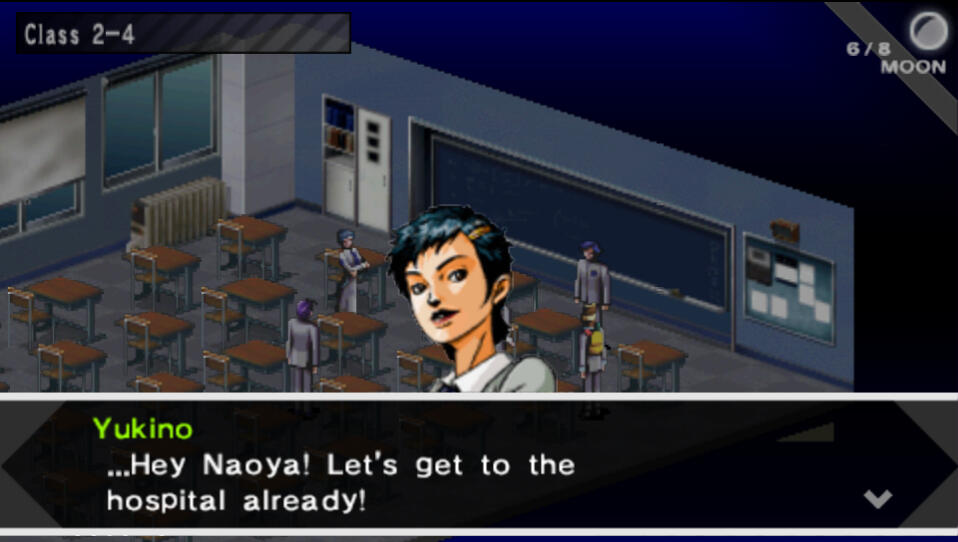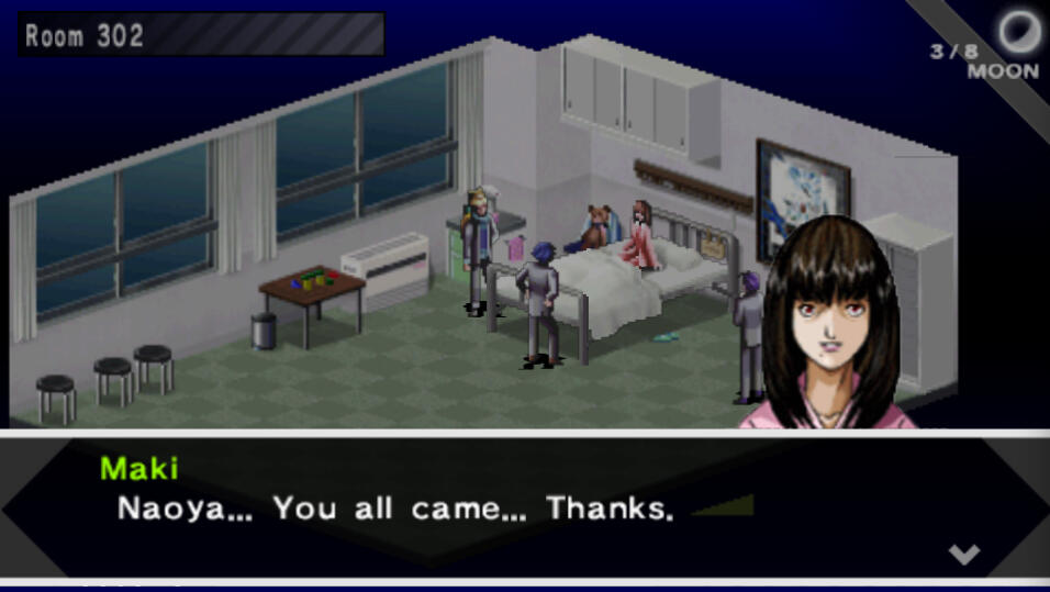 From the area of the map with Joy Street, just head north one screen to find Mikage Hospital. After entering, there is a short cutscene. Once it's over, go ahead and enter the door. Maki is in Room 302 so just head straight to 3F and enter the second door on the right.After some scenes, you will find yourself looking at the battle screen for the first time. This first battle happens automatically like a cutscene. After the battle you will all level up, go ahead and allocate your MC's points however you like. The other party members will auto-allocate their points. Once the scenes are all over and you're in control again, speak to everyone if you like, and then exit the room.There will now be random encounters. Please note that the Analyze feature does not take up a turn, and all you have to do to unlock the details for each creature is defeat them in battle once. From then on, you'll have all their weaknesses and info when you encounter them again. This is a crucial and very useful feature.The Contact feature allows you to enter a negotiation with the demons to gain various things such as items, or healing. But the most important thing here is Spell Cards. To get their Spell Cards, you must raise their eagerness (yellow) to max. This is honestly kind of hard to figure out on your own, so I have included a complete guide on what to say to each specific persona hereTurn south and enter the first room around the corner to find the 2F Nurse's Center. Open the chests to find Medicine x6 and QQ Helmet x2. Equip the helmets, exit the room, and head west. Enter the room around the corner to find an Agastya Tree. When finished, head up the stairs to 3F.Follow the path until you reach the second fork. Enter the Nurse's Station to the right and open the chests to find DisPoison and QQ Helmet x2. Equip the helmets on your other two team members, then exit the room. Head down the halls northwest until you find the stairs. Go downstairs to 2F.Follow the left hallway around to the first room you see to find another Agastya Tree. Then, head straight east to find another set of stairs. Go down the stairs to 1F.Hug the corner around to the right and follow the hallway until you reach a fork. Take a right at the fork and you'll find a room with a doctor in it. He will heal you, so this hallway is a great spot to grind a bit before moving on. For the Snow Queen Quest, I recommend doing so until you are at least level 15. In fact, it's a common strategy to have your party members guard, and have MC spam his persona spells. The reason why is because they will leave your party and rejoin you at YOUR level a bit later. So if you just focus on him, you essentially grind all of them at once. Your personas will rank up faster if you use their skills in battle. Make sure to open the chest to find Medicine x2.Once you are ready to move on, take the other path from that fork until you reach a room straight ahead at another fork. Enter to find an Agastya Tree. Go around to the room behind this to find the Reception Desk.After the cutscene you'll have the option to save the nurse or not. If you decide to save the nurse, Elly will arrive and you'll fight some zombies. Saving the nurse is one of the crucial “moral” choices that will affect the ending. This is also an automatic battle that gives a lot of exp, so I recommend trying to save the nurse. Elly will temporarily join the party afterward. If you're not planning to use her as your 5th member, then give her weapon to MC. Exit the hospital then head south to the next screen, keeping in mind that there are now random encounters on the City Map.