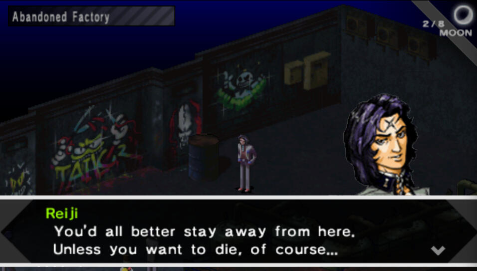 For starters, I would like to immediately point out that if you hold down ▢ it will show you all locations you can interact with. This makes the map travel much easier. From St. Hermelin, head north one screen, and then east one screen. Enter Joy Street. I had you come here for two reasons. One, to introduce you to this general shopping area which you'll find very useful, and two, in case you are still considering the SEBEC route and getting Reiji. If you're not doing that, I just recommend buying yourself some healing and SP items to help you on your journey.Reiji Recruitment (SEBEC only): Once inside Joy Street, enter Judgement 1999 which is the first door on your right. Speak to the blond man next to Mark for some more details about Reiji. When you leave the casino, the door directly across the hall leads to another Agastya Tree.Leave Joy Street. Head one screen south to find the Abandoned Factory. Enter it for another scene with Reiji. Now head back to Joy Street and find the Yin Yan shop, which is located on the western area of the map. Speak to the woman in yellow to find out more details about Reiji. You MUST answer Yeah and Sure for Reiji to join you later.Once you're done exploring, shopping, and/or doing your Reiji tasks, you can go ahead and finally head to Mikage Hospital.