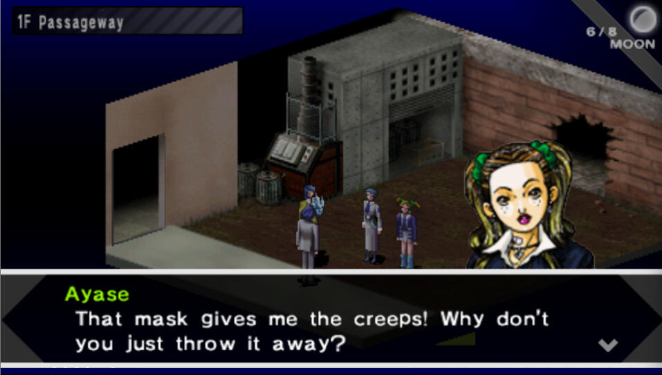 Sooooooooooooooo, we're kind of going straight into another boss fight. Whenever you're ready, head into the Courtyard, which is located just south of the shops and across the hall from the Cafeteria. After a brief cutscene, it's time for the boss.Boss: Lady Masquerade: She resists all regular weapons(guns are fine), is weak against Electric, Nuclear, and Blast, and she absorbs Gravity and Ice. Try your best to stay healed up and stick to guns and her weaknesses as much as possible until you can finish her off.After you're done with the boss fight and the following cutscenes, make sure to save your game at the Infirmary, as always. The Weapon Shop and the Armor Shop have new gear, so make sure to grab what you need for the final dungeon. Whenever you're ready, head to the far south to the door that was previously frozen shut. Inside you'll find a giant ball of plasma, your party, and either Nanjo, Brown, or Elly(whichever one was NOT in your party). Speak to that person to recieve one of the following items:Nanjo: Phurba Dagger
