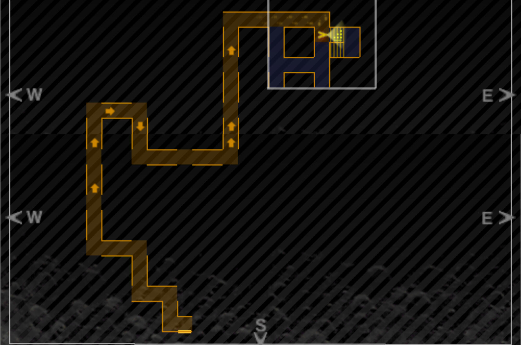 Once on the other end, continue until you hit another darkened area. This one has 2 entrances, enter the western one. Your directions are as follows:North, North, North, East, East, North, East*, East.It should look like this:
